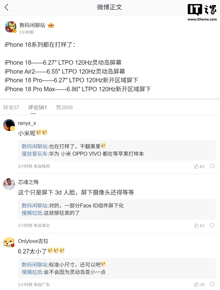 iPhone 18 —— 6.27" LTPO 120Hz 灵动岛屏幕iPhone Air2 —— 6.55" LTPO 120Hz 灵动岛屏幕iPhone 18 Pro —— 6.27" LTPO 120Hz 新开区域屏下iPhone 18 Pro Max —— 6.86" LTPO 120Hz 新开区域屏下该博主称,iPhone 18 Pro / Pro Max 将实现一部分 Face ID 组件屏下化。
