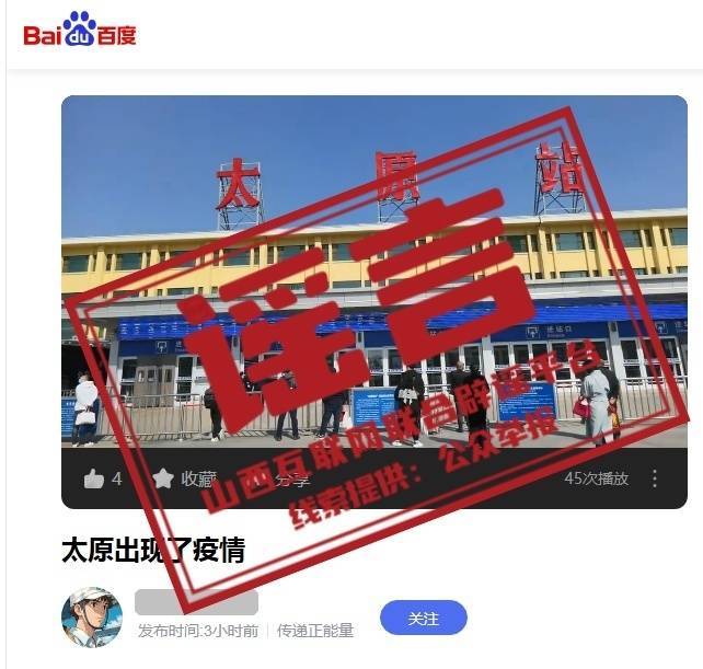 2月15日,网上出现“太原出现了疫情”的消息,经调查核实,以上为不实信息,望广大网民对谣言不听、不信、不传。